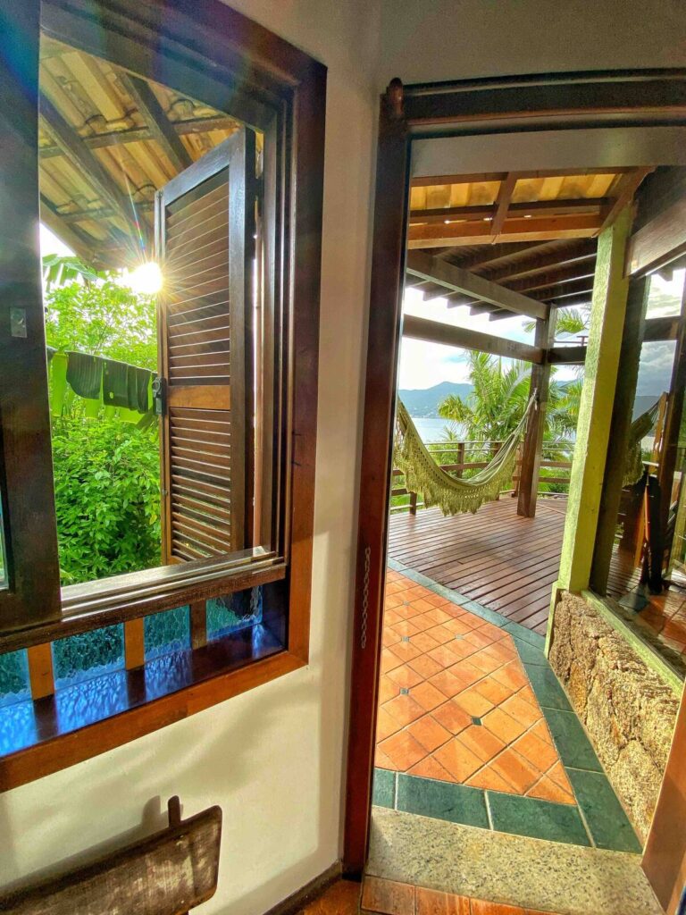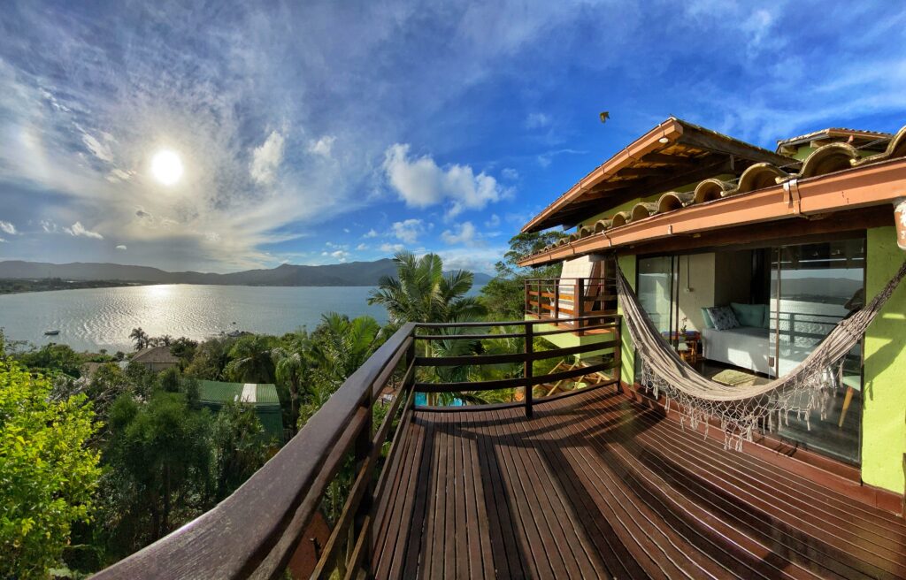 HOUSE OF MANACÁS is a 300-square-foot home with a beautiful, privileged view of the sunset over Lagoa da Conceição. It features 3 bedrooms, a mezzanine, 3 bathrooms (master suite with bathtub), a fireplace, and a barbecue grill.